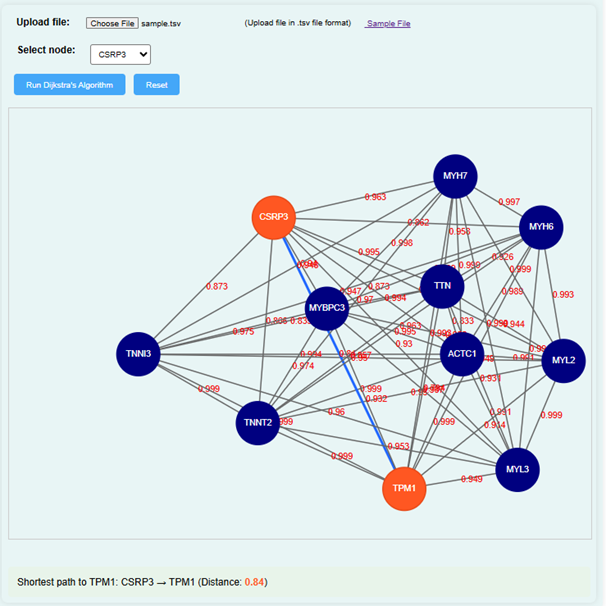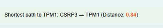 - The simulator will calculate the shortest distance between the selected genes and display the result on the screen. For example, if the distance between CSRP3 and TPM1 is 0.84, it will be shown in the GUI.