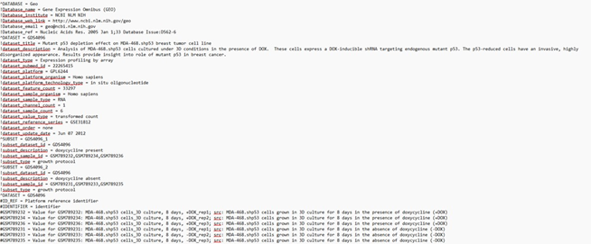 Given an example of Sample gene expression data in FASTA format, obtained from GEO database