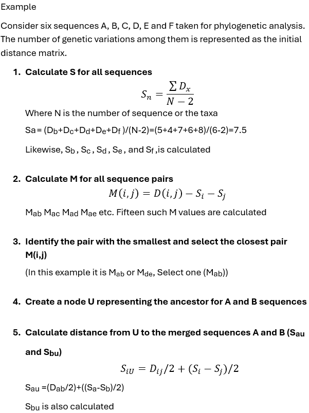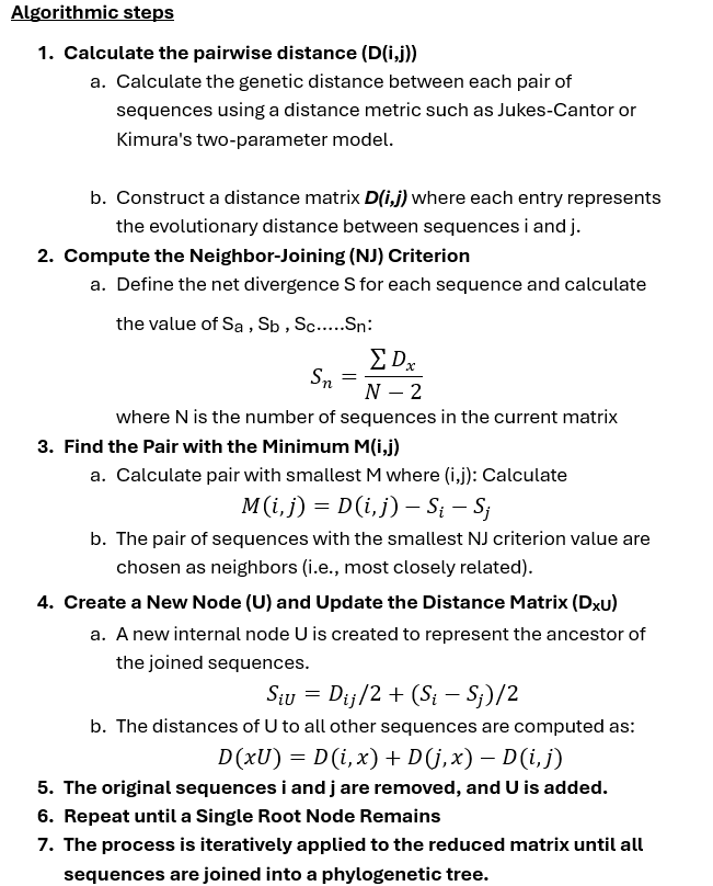 The NJ algorithm follows a bottom-up clustering approach, progressively merging closely related sequences (or taxa) based on their pairwise evolutionary distances. Unlike UPGMA (Unweighted Pair Group Method with Arithmetic Mean), which assumes a constant rate of evolution and considers only absolute distances, NJ accounts for variations in evolutionary rates, reducing the risk of errors.