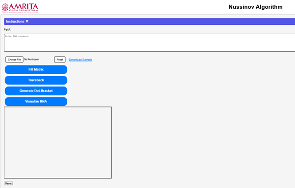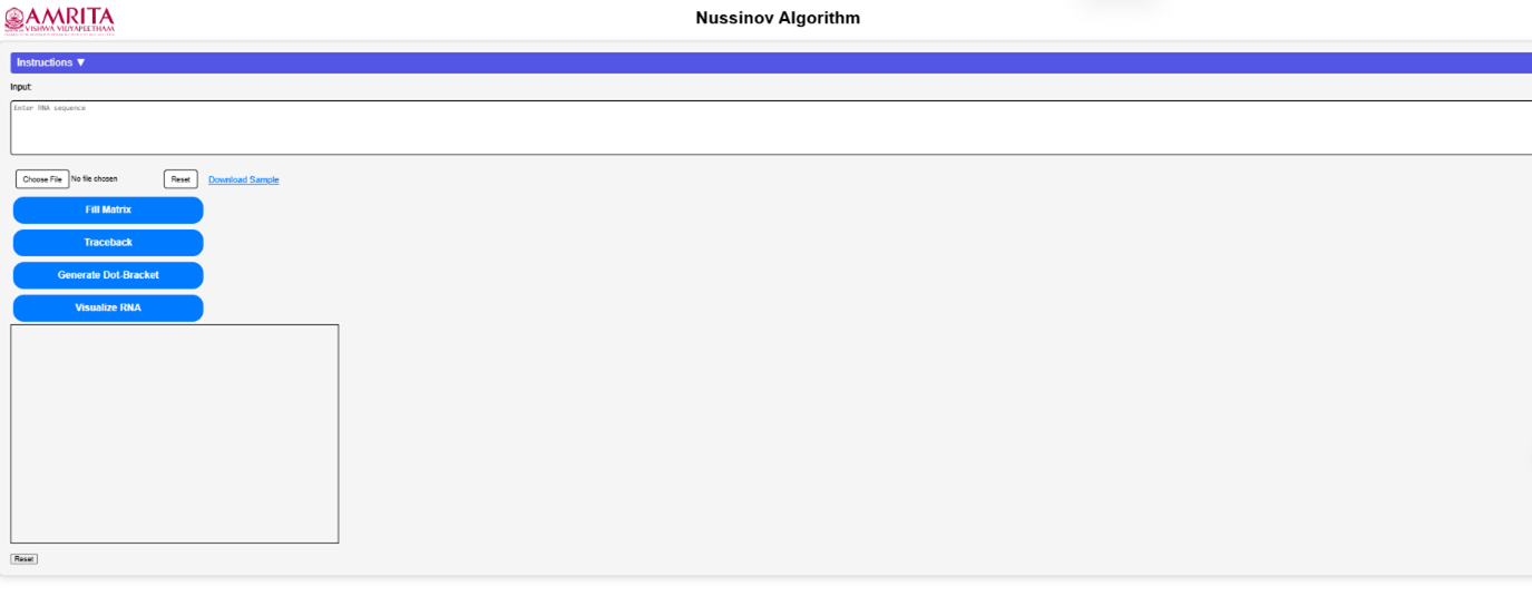 User can manually enter an RNA sequence into the input box. Alternatively, download a sample RNA file (. fasta format) from the page and upload it using the “Choose File” button.