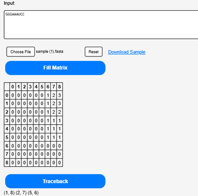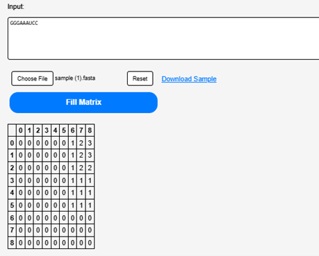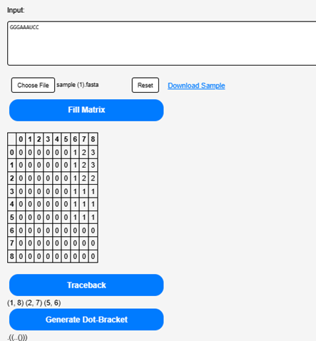 Click on the “Fill the matrix” button to calculate the possible base pairs within RNA sequence