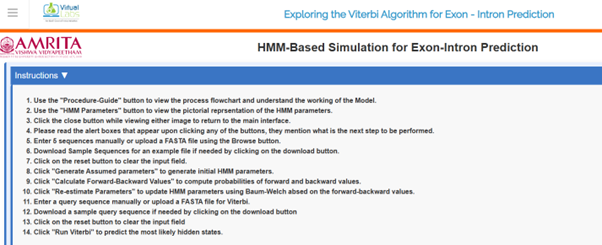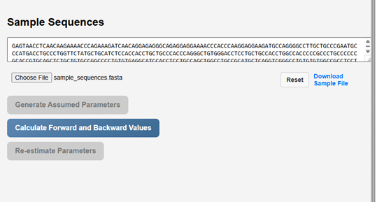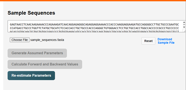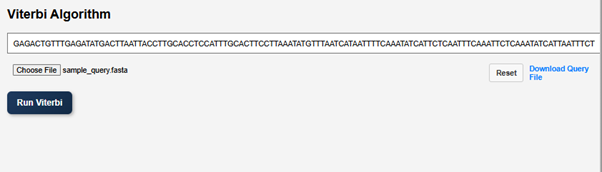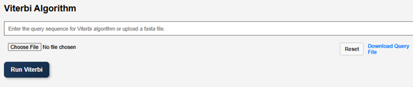 - Enter the query sequence for the Viterbi algorithm or upload a FASTA file. A sample query file is provided in the GUI. Users can download the file and upload it as a query file.