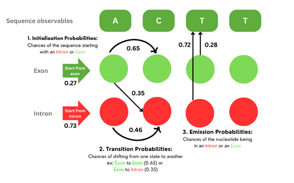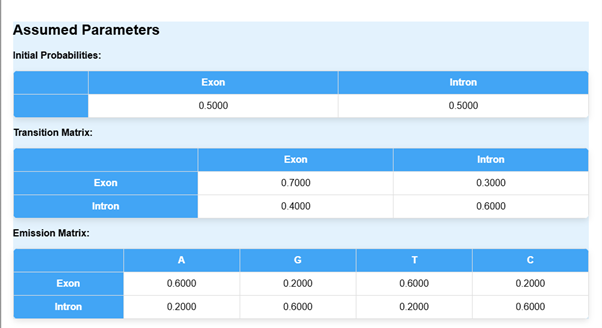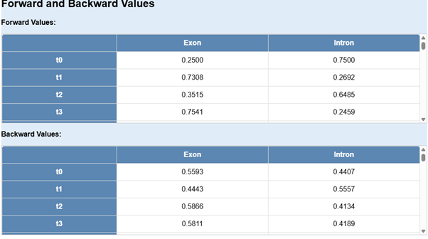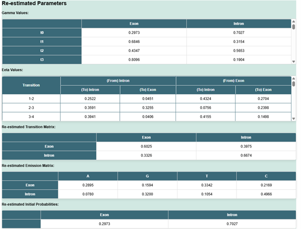 - Users can click on the HMM Parameters tab at the bottom of the GUI to learn initialization probabilities, Transition probabilities, and emission probabilities of HMM model for exon-intron prediction in a given sequence.