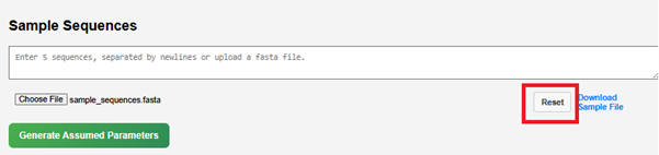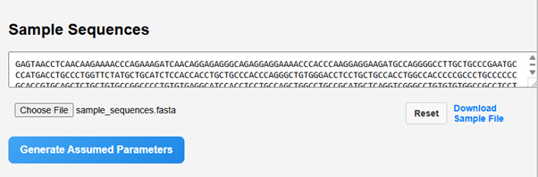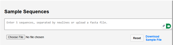 - To start the experiment, provide sample sequences in the provided query box. The sample sequences need to be separated by newlines. Also, a user can upload a FASTA file. A sample FASTA file is provided in the GUI. Download the file, and users can use the sample FASTA file for running the simulator.