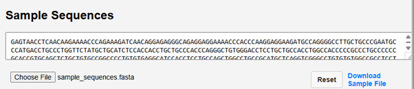 - Click on the Choose file button to upload the sample FASTA file. The query box will show the uploaded sequence data.