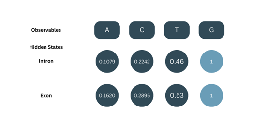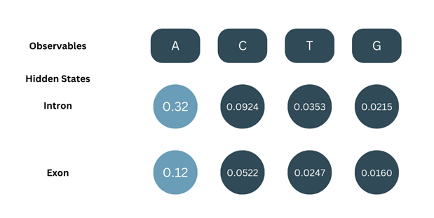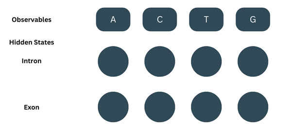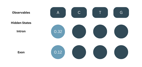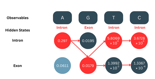The Viterbi algorithm is dynamic programming that determines the optimal state path in the HMM, emitting the given sequence with the maximum probability. The HMM has two main entities, observables and hidden states. Observables are the elements seen by the user, but the hidden states are unknown and inferred based on the observables and their patterns. In the case of nucleotide sequence, the observables are individual bases while the hidden states would be introns and exons. That is, in case of sequence analysis, the Viterbi algorithm can be used for predicting coding and non-coding sequences. Similarly, for protein sequences, the observables would be the amino acids, and the states could be motifs and patterns. The three parameters that link the hidden and observable patterns are emission probabilities, transition probabilities, and initial probabilities. In case of gene finding, HMM includes states that represent different regions of a gene, such as the "start codon," "exon," "intron," and "stop codon." Each state specifies distinct probabilities of emitting specific nucleotide sequences.