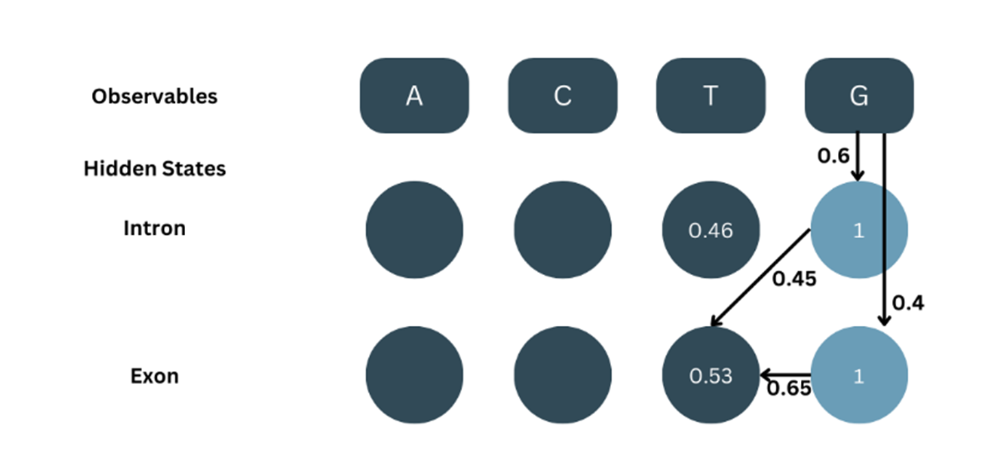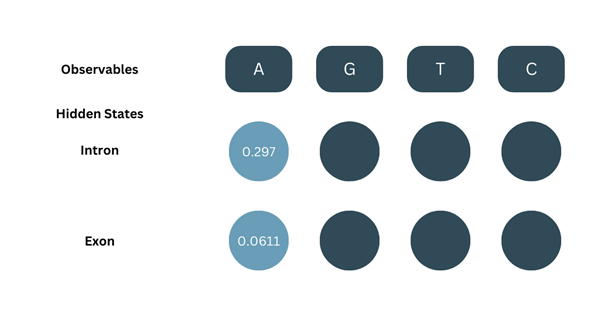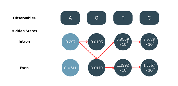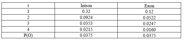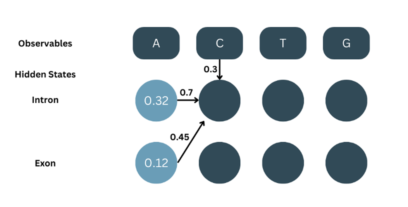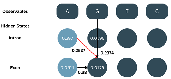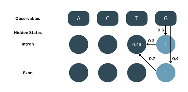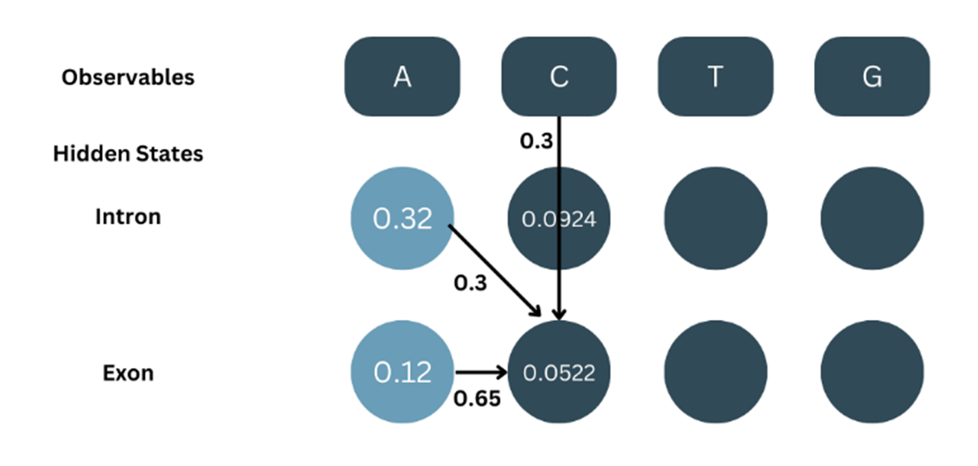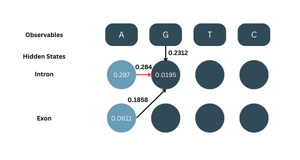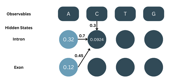 At t=2, O=C. For the next part, we’ll be considering the probability of both the previous states and adding them up i.e., For C to be an intron, we consider the transition of A in intron to C in intron and A in exon to C in intron and sum both the probabilities.