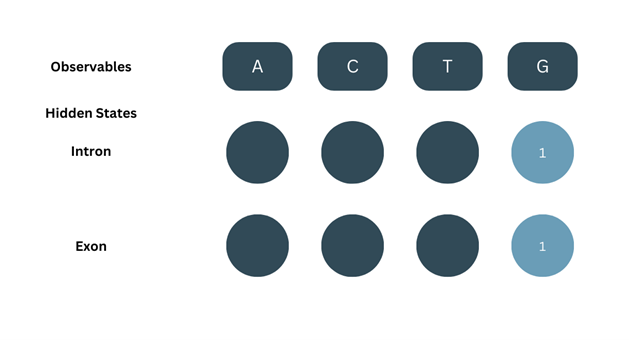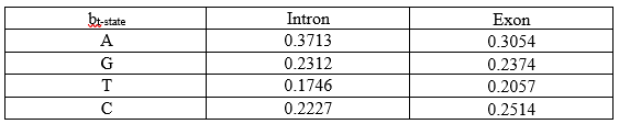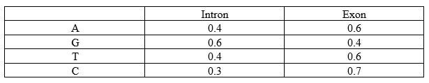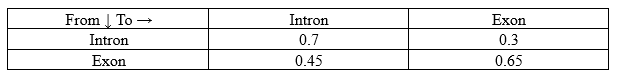 Let’s consider a simplistic application of HMM on nucleotide sequences. It is clear that introns always start with GT and end with AG and that GC-rich regions are usually intronic. Based on that, the assumed probabilities would be: