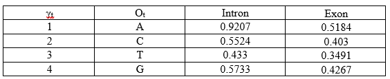 b(A-intron) = Σ (if O=A)(γt-intron) / Σ γt-intron Since we have taken a simple sequence, the we have only one γt-intron value where O=A. The denominator, is the sum of all γt-intron values regardless of what O is.