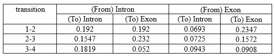 Re-estimation for this step is done for each kind of transition (eg., intron-intron, exon-intron etc.) For each kind of transition, the summation of transition probabilities is divided by summation of the γt value of the state at t. But note that here, the summation is done only until t=T-1 because transition probabilities cannot be calculated for the last position as there is no transition.