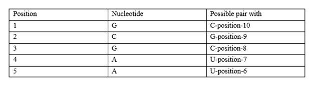 Guanine (G) can also pair with Uracil (U), though these pairs are less stable. Applying to the given RNA sequence: For 5′−GCGAAUUCGC−3, possible base pairings are
